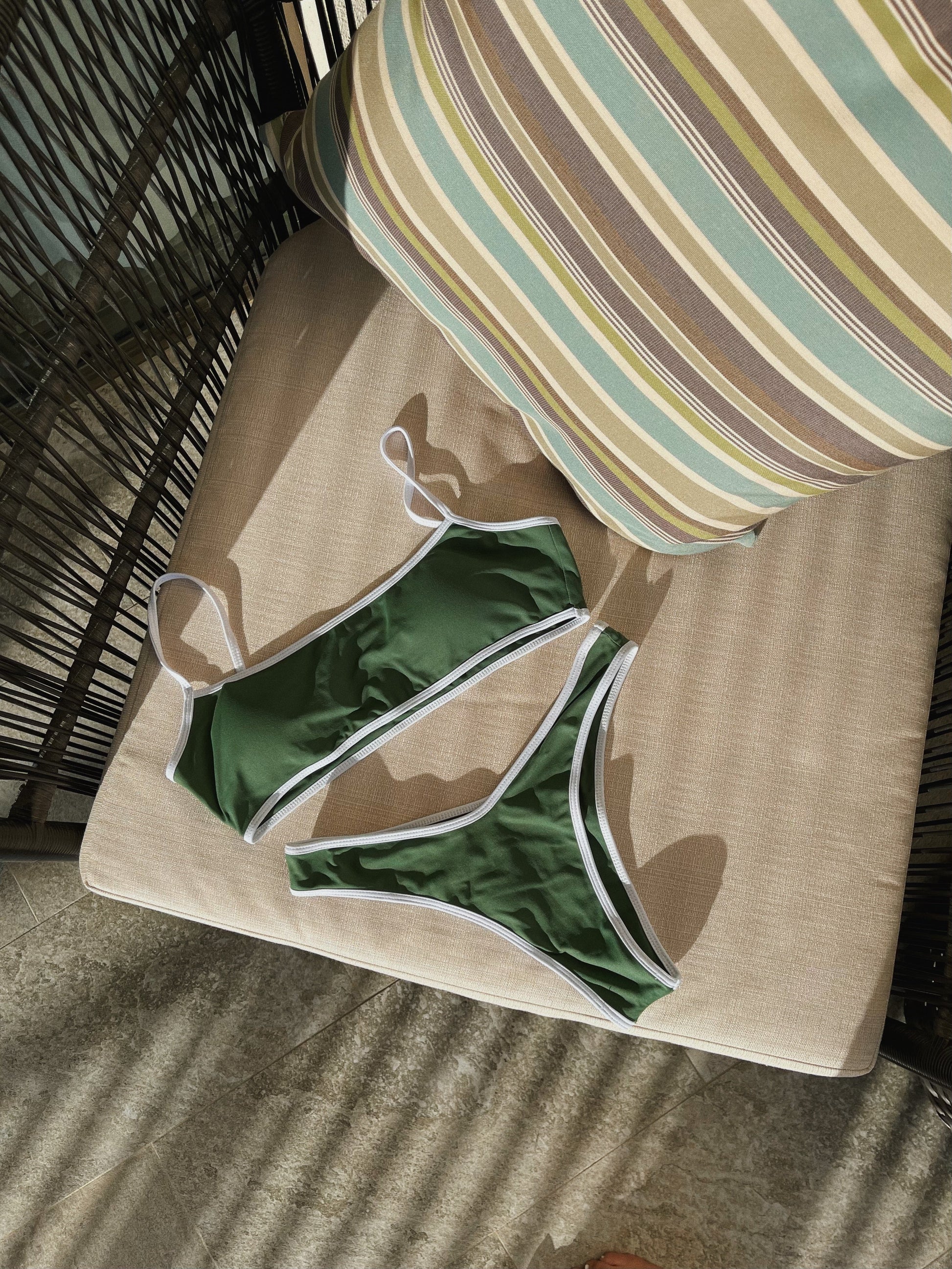 A simple two-toned bikini top that can be paired with a high-cut cheeky bottom (sold separately) . Made with sustainable and biodegradable fabric.